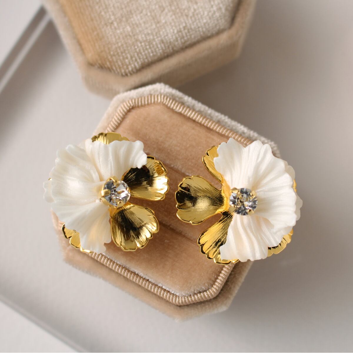 重厚感のある真鍮パーツにドレープの効いたフラワーを重ねたアイテム