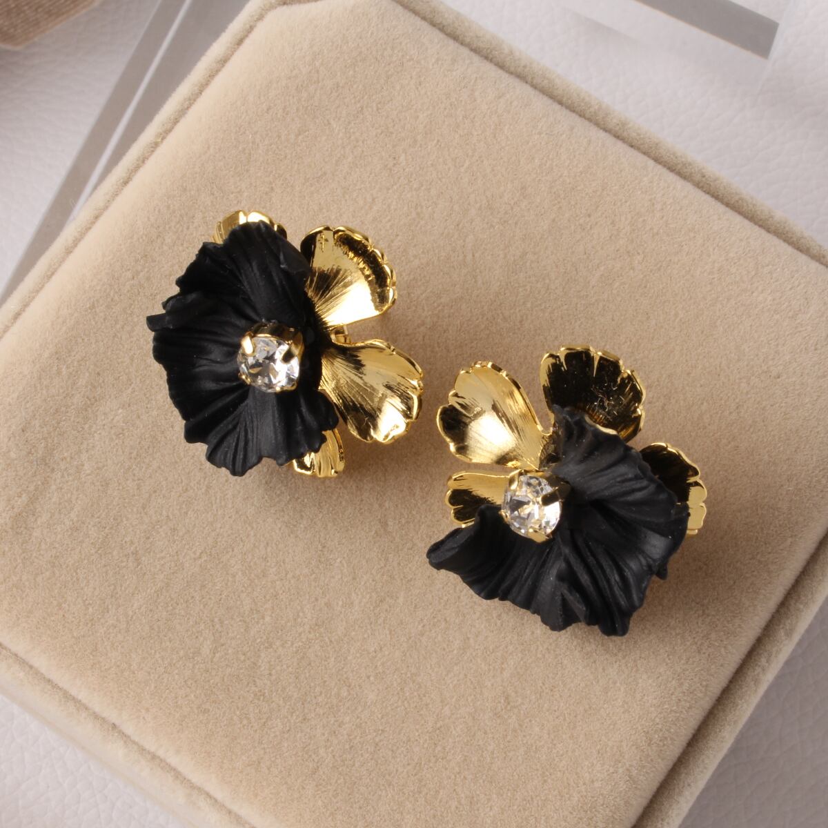 重厚感のある真鍮パーツにドレープの効いたフラワーを重ねたアイテム